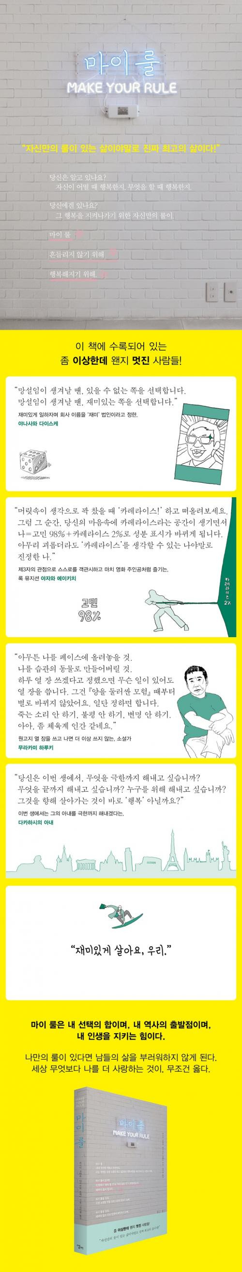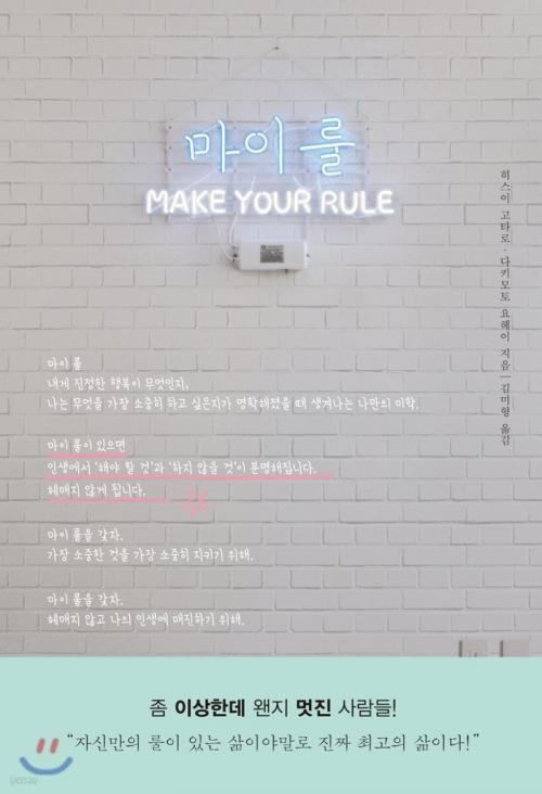 ‘마이 룰’이란, 나의 행복을 실현하기 위한 나만의 미학. 마이 룰이 있으면 인생에서 ‘해야 할 것’과 ‘하지 않을 것’이 분명해진다. 헤매지 않게 된다. 마이 룰이 있으면 내게 가장 소중한 것이 분명해진다. 인생을 어떻게 살아야 할지가 명확해진다. 어지러운 인생이 정리가 된다.